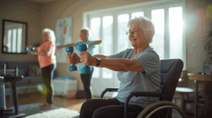 วิธีปฏิบัติ: ใช้อุปกรณ์ง่าย ๆ เช่น ดัมเบลขนาดเล็ก (ขวดน้ำ), ยางยืดออกกำลังกาย (Resistance Bands), หรือ การใช้น้ำหนักตัว เช่น การลุกนั่งจากเก้าอี้