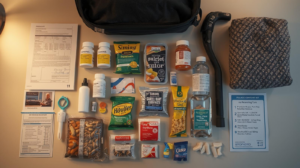 อุปกรณ์ช่วยความสะดวก — ขวดน้ำขนาดพกพา (ผู้สูงอายุต้องดื่มน้ำบ่อย), อาหารว่างพลังงานสูง (เช่น ถั่ว ขนมที่ไม่บูดง่าย), หมอนรองคอ ผ้าห่มเล็ก และอุปกรณ์เสริมเช่นไม้เท้าพับได้ หรือตะกร้าสำหรับรถเข็นแบบพกพา
